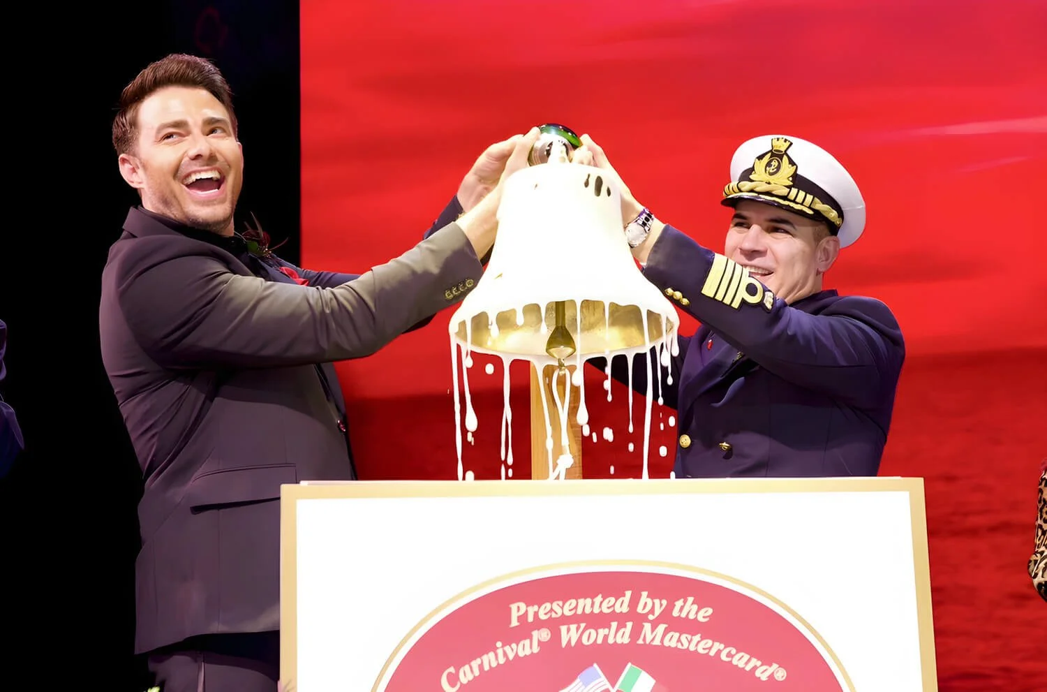 Godfather Jonathan Bennett and Captain Enzo Palomba Christen Carnival Firenze. (Image courtesy of Carnival Cruise Line)