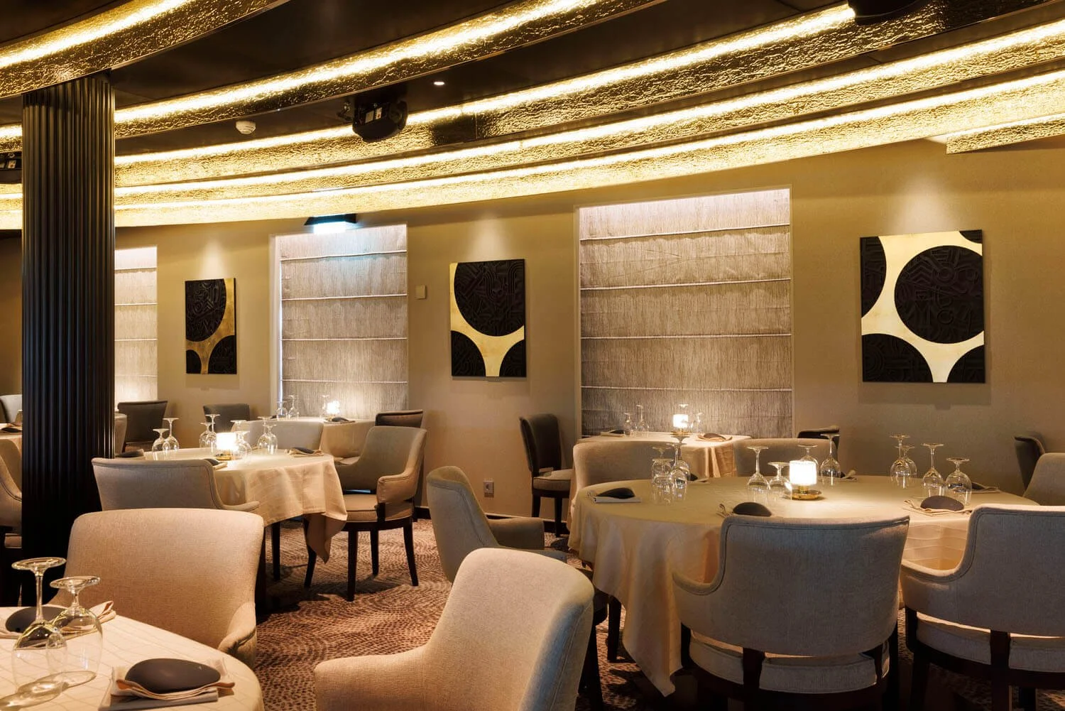 In the concealed Library on deck 10, Albanian artist Artur Sula has created an arresting mural on the ceiling, inviting visitors to survey the sea and look deep into the constellations of the night’s sky. The work, covering 280 square feet, was hand-painted in place and highlighted using 24K gold leaf.